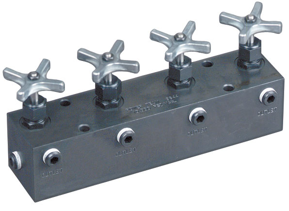 分配器。當(dāng)需要安裝多個(gè)油缸時(shí),該分配器非常有價(jià)值。具有六個(gè)3/8" NPTF接口,可處理較大的多油缸系統(tǒng)。 |